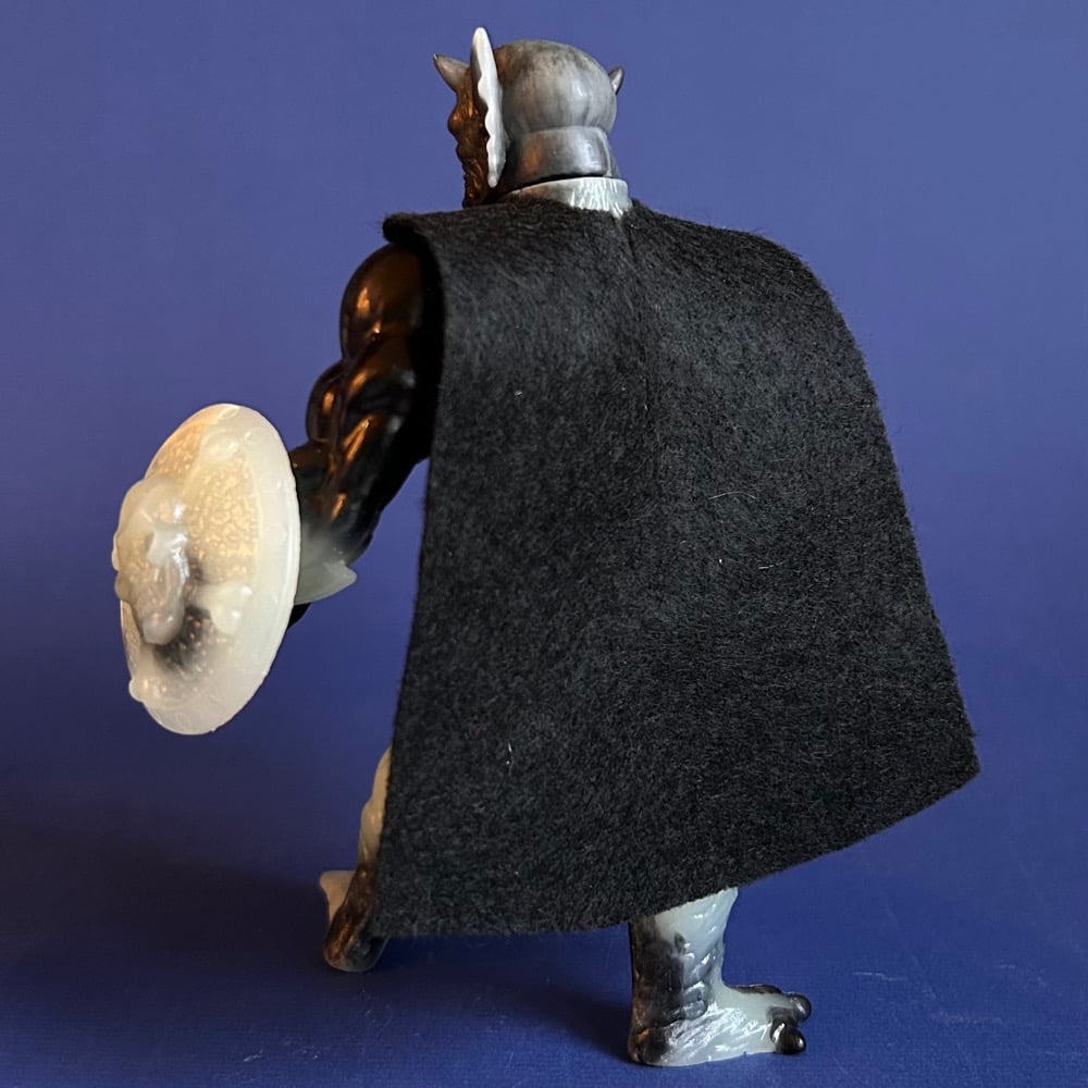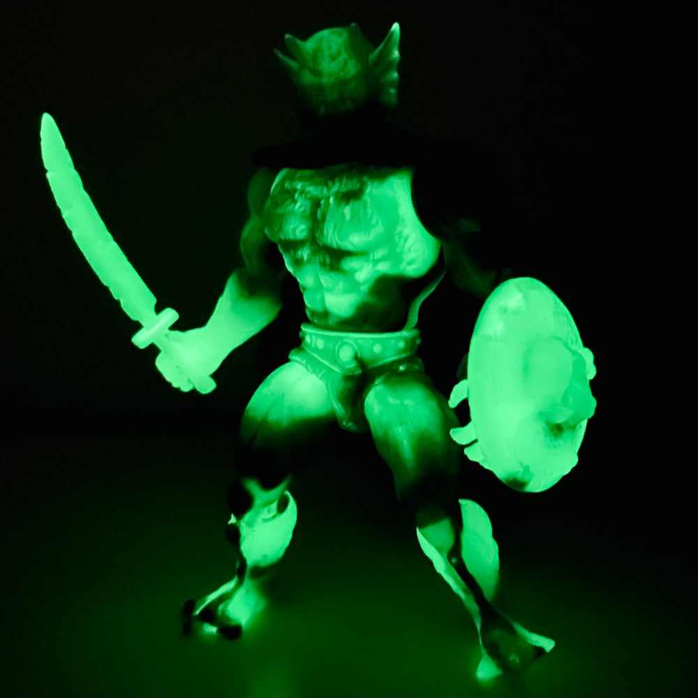 100% handmade: cast in marbled black and glow in the dark white, fully articulated (in arms, waist, head and rubberband legs) comes with glow in the dark shield and sword, removable black cloth cape.