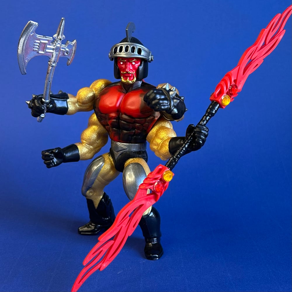 100% hand made, fully articulated (all 4 arms, waist, neck, rubberband legs and visor), one of a kind 5.5” action figure. Comes with fire staff and chrome axe